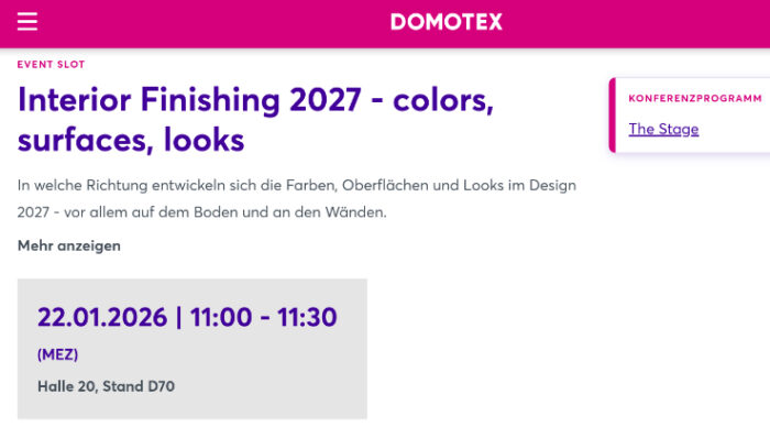 Sie beschäftigen sich gerade mit den Trends 2027? Vielleicht ist dann mein Vortrag auf der Domotex interessant für Sie. Am 22.01.2026 von 11:00 – 11:30 Uhr halte ich dort einen Vortrag zum Thema „Interior Finishing 2027 – colors, surfaces, looks“. Es geht darum, wie sich die Farben, Oberflächen und Looks …